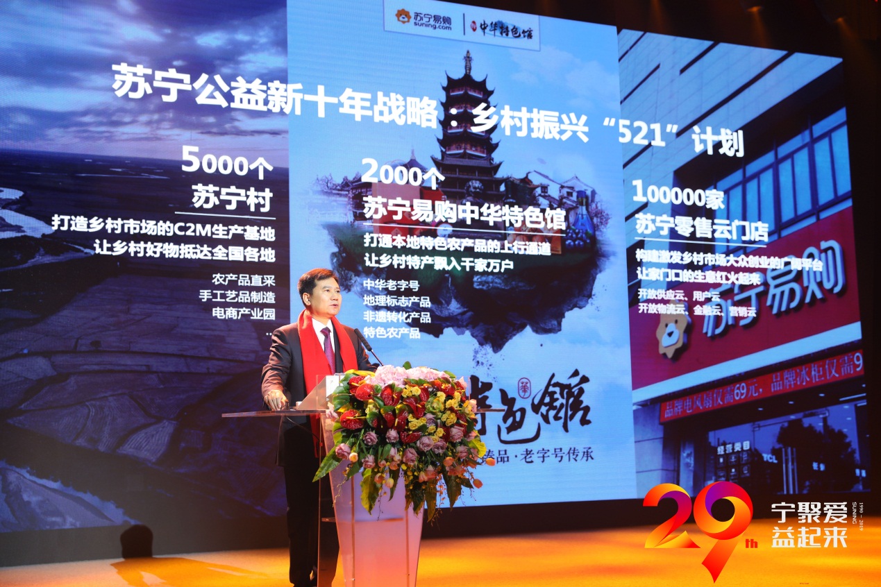 就在12月26日舉行的“蘇寧29周年公益慶生儀式暨新十年公益戰(zhàn)略發(fā)布會”上,蘇寧控股集團董事長張近東發(fā)布了蘇寧鄉(xiāng)村振興“521計劃”,中華特色館是其中重要部分,未來十年要達到2000個。同時,蘇寧村將會建設(shè)至5000個,蘇寧易購零售云門店則將要開到10萬家。張近東表示,“521”取自三個目標的首個數(shù)字,同時也寄托著著蘇寧幫扶鄉(xiāng)村、振興鄉(xiāng)村的深切感情。