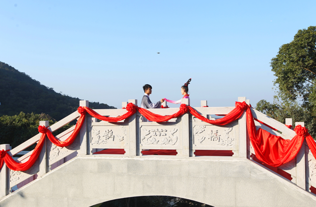 深圳新聞網(wǎng)2019年12月28日訊 暖陽普照的冬日,與相愛之人執(zhí)手而行,許下相伴永遠(yuǎn)的愿景,是怎樣一幅浪漫的畫面?如今,東莞樟木頭觀音山風(fēng)景區(qū)異木棉花開滿園,“粉紅花?!蔽吮姸嗲閭H、夫妻前來打卡,他們攜手走進(jìn)景區(qū),迎來了新的浪漫體驗。近期,為夯實景區(qū)姻緣文化,為游客營造豐富的姻緣打卡氛圍,觀音山“鵲橋”正式亮相。橋上是牛郎織女的執(zhí)手相望,唯美愛情的浪漫,橋中滿塘荷花與錦鯉相伴,成為玉露瓶與同心鎖的聯(lián)結(jié),鵲橋一“上線”便獲贊聲一片,俘獲了不少情侶、夫妻游客的芳心。