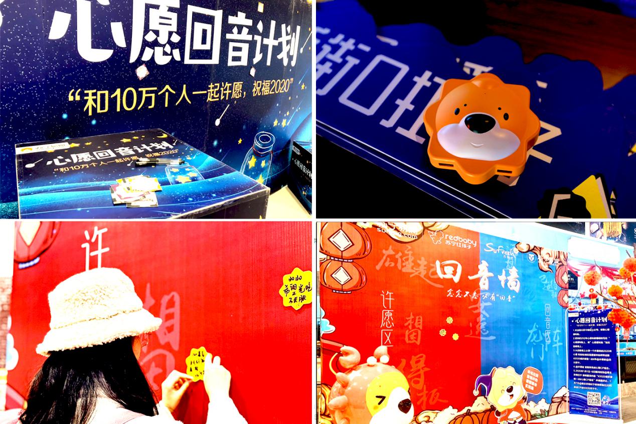 “心愿回音計劃”率先在南京徐莊園區(qū)啟動,蘇寧小店搭建起巨大的許愿瓶,瓶身通體為湛藍(lán)色,在藍(lán)色的背景中猶如海上漂流,并且內(nèi)置數(shù)不清的心愿球,許愿者可以在心愿球上寫出個人心愿,投回許愿瓶后等待圓夢,將會“和10萬個人一起許愿,祝福2020”。