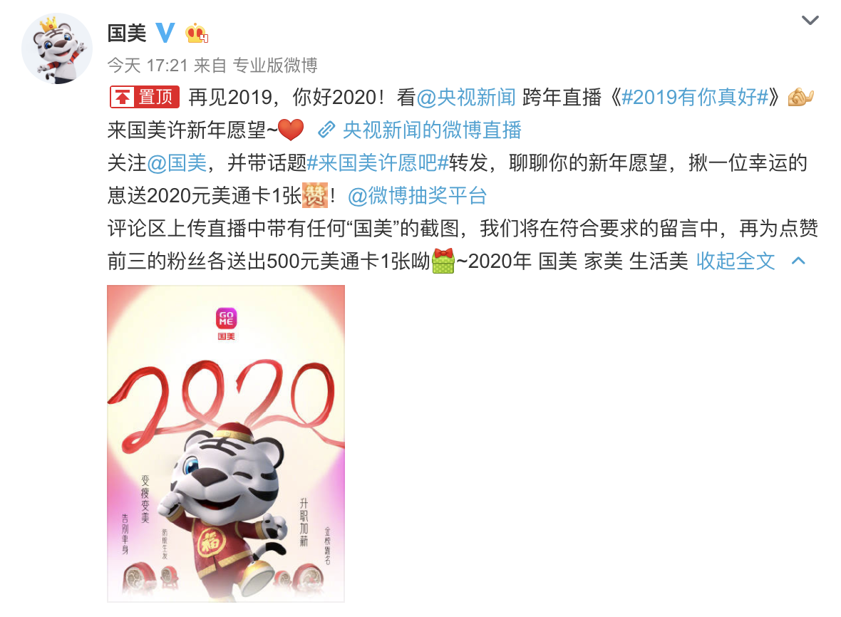 今年是國(guó)美首次聯(lián)合央視新聞跨年直播,為實(shí)現(xiàn)廣大國(guó)美用戶的心愿,回饋消費(fèi)者。國(guó)美還在微博啟動(dòng)多個(gè)有獎(jiǎng)轉(zhuǎn)發(fā)活動(dòng),獎(jiǎng)品為面值200元、500元、2020元的國(guó)美美通卡,如果沒(méi)有趕上央視新聞的跨年直播,還可在國(guó)美官方微博參與抽獎(jiǎng),新的一年有好的開(kāi)始,沒(méi)準(zhǔn)下個(gè)錦鯉就是你!(常軍平)