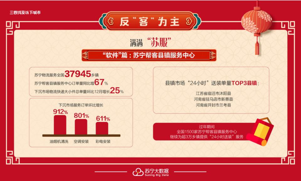 三四線(xiàn)城市則設(shè)立了蘇寧幫客縣鎮(zhèn)服務(wù)中心,數(shù)據(jù)顯示春節(jié)蘇寧幫客訂單量同比增長(zhǎng)67%,TOP3縣鎮(zhèn)為宿遷沭陽(yáng)縣、貴港桂平市、福州閩侯縣;最受歡迎服務(wù)為電視送裝一體服務(wù),訂單量同比增長(zhǎng)89%。在過(guò)年期間,全國(guó)1500家蘇寧幫客縣鎮(zhèn)服務(wù)中心,將繼續(xù)為超3萬(wàn)鄉(xiāng)鎮(zhèn)提供“24小時(shí)送裝”服務(wù)。