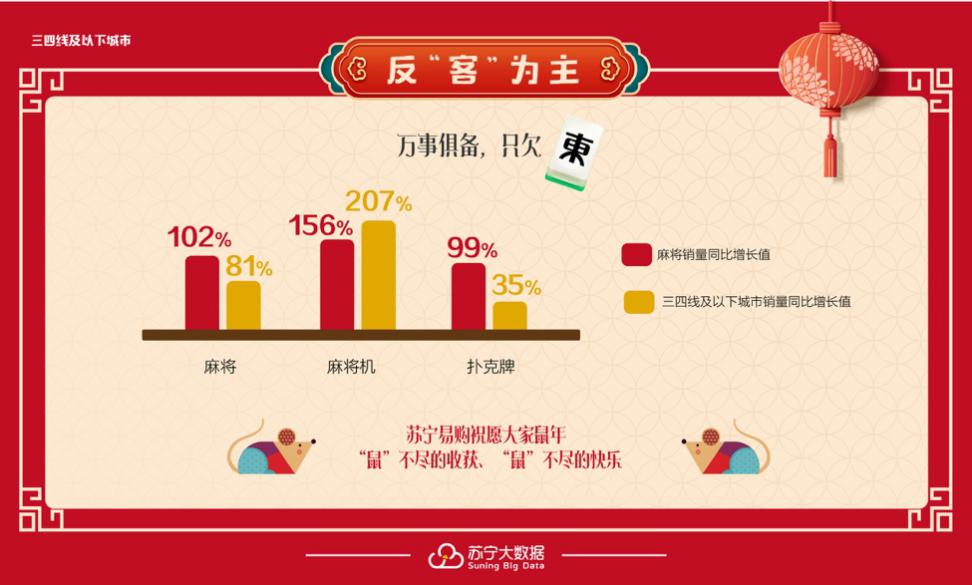 除此以外,春節(jié)作為“熬夜黨”們的主戰(zhàn)場(chǎng),零食和麻將一直是必備物料,三四線(xiàn)城市在這其中的消費(fèi)力也有了明顯增長(zhǎng)。蘇寧數(shù)據(jù)顯示,零食禮包銷(xiāo)量同比增長(zhǎng)137%,三線(xiàn)及以下城市銷(xiāo)量同比增長(zhǎng)158%;堅(jiān)果禮包銷(xiāo)量同比增長(zhǎng)142%,三線(xiàn)及以下城市銷(xiāo)量同比增長(zhǎng)279%;麻將銷(xiāo)量同比增長(zhǎng)102 %,三四線(xiàn)及以下城市銷(xiāo)量同比增長(zhǎng)81 %;麻將機(jī)銷(xiāo)量同比增長(zhǎng)156 %,三四線(xiàn)及以下城市銷(xiāo)量同比增長(zhǎng)達(dá)到了207 %。
