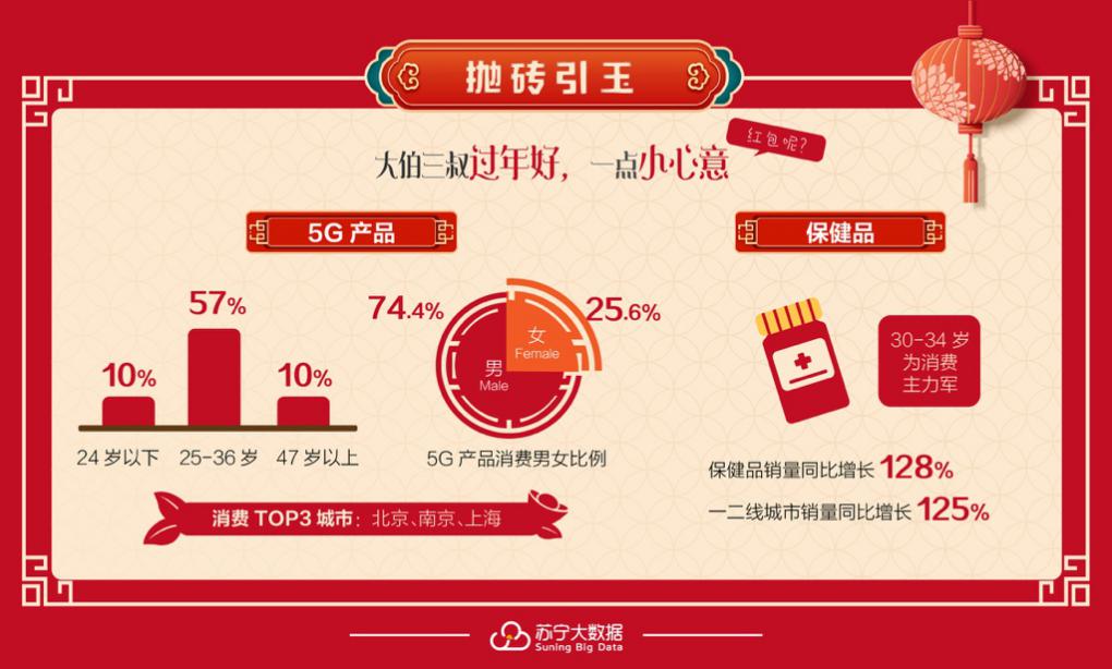 要說(shuō)2019年末人們討論最多的關(guān)鍵詞有哪些,5G一定是其中一個(gè)。除了保健品,5G產(chǎn)品成了人們的春節(jié)消費(fèi)新寵,報(bào)告顯示,5G產(chǎn)品銷(xiāo)量最好的三個(gè)城市分別為北京、南京、上海,消費(fèi)者年齡主要集中在25-36歲之間,占比總體的57%。有趣的是,24歲以下的年輕人和47歲以上中老年人,占比均在10%左右??磥?lái)年輕人回家過(guò)年也不忘把“潮流單品”帶給父母一輩。