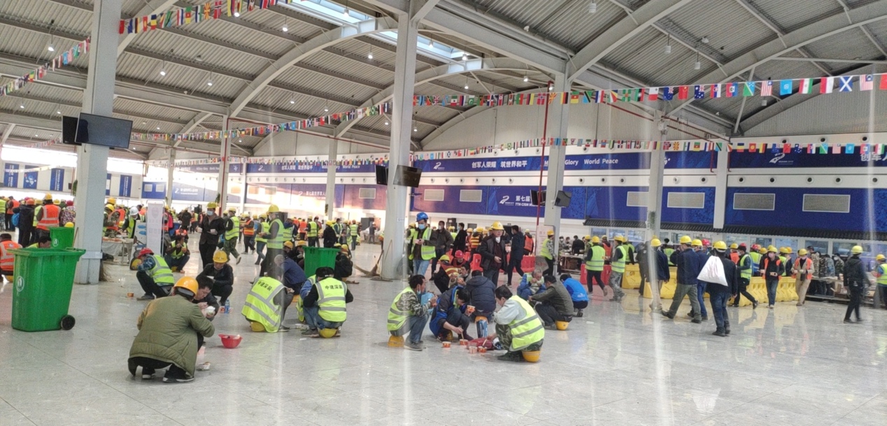 中午就餐時(shí),提醒大家“分開就餐,對疫情時(shí)刻保持警惕”的廣播聲不絕于耳。偌大的空地上,不少工人都謹(jǐn)慎地與同事們分開適當(dāng)距離,蹲在地上開始快速用餐。同樣也包括楊杰,“吃飯要保持距離。我們快點(diǎn)吃完,就能快點(diǎn)回去繼續(xù)干?!?/p>