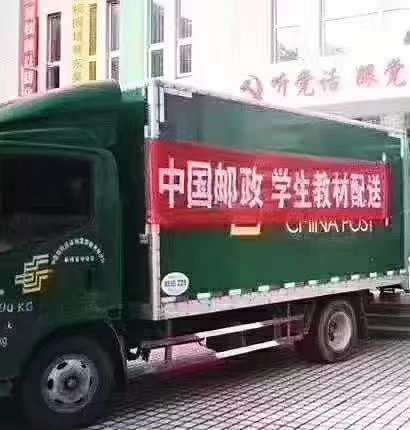 沉重的數(shù)百捆新教材,封面眼花繚亂的各類課本、練習(xí)本、光碟,最后都在工作人員的手下,變成一個個方方正正的包裹,靜靜地等待著一輛輛綠色的郵車駛來,把他們傳遞到小主人的手上。