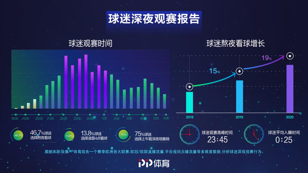 隨著年輕人群夜生活的豐富、工作壓力大、失眠等問題,睡眠時間越來越少。PP體育通過收集過去一個賽季歐洲各大聯(lián)賽0點后直播流量、歐冠/歐聯(lián)賽事直播流量、平臺夜間點播流量等多維度數(shù)據(jù),重點分析了球迷觀賽行為。從數(shù)據(jù)中看出,熬夜看球已經(jīng)成為鐵桿球迷的自我修養(yǎng)。