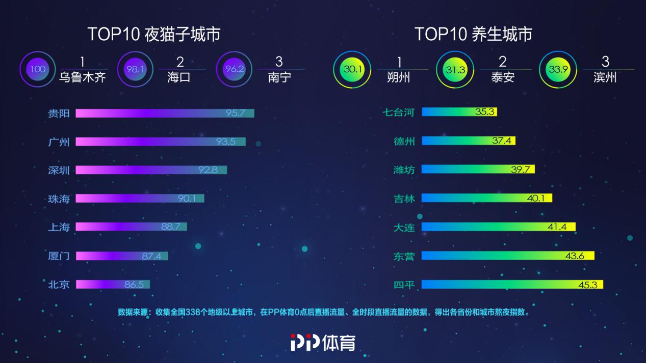 PP體育還通過收集分析了全國338個地級以上城市用戶的觀看數(shù)據(jù),得出了全國省市和城市的熬夜指數(shù)。透過這份報告,我們能看出原來地域不同的熬夜情況存在著極大差異。從全國各省份熬夜觀賽的球迷分布來看,由于新疆與北京時間有兩小時的時差,憑借天獨厚的地理優(yōu)勢,新疆球迷自帶熬夜光環(huán),成為全國熬夜大賽冠軍。其他進入前五名的省份被南方省份包攬,分別是貴州、廣西、廣東和福建,南方球迷無疑是熬夜看球的主力軍。