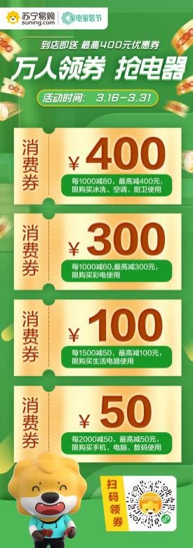 深圳蘇寧針對整個粵東區(qū)域投放近20萬張消費券,該券根據(jù)可用產(chǎn)品類型分為400元、300元、100元、50元四種不同面值。消費券以電子券為形式發(fā)放,消費者可通過深圳蘇寧微信公眾號、深圳蘇寧官方微博、蘇寧云店小程序和蘇寧易購門店進行領(lǐng)取,領(lǐng)取成功后,消費券將自動存儲在消費者的蘇寧會員賬戶中,使用時系統(tǒng)會根據(jù)購買的商品類別進行自動適配和抵扣結(jié)算。