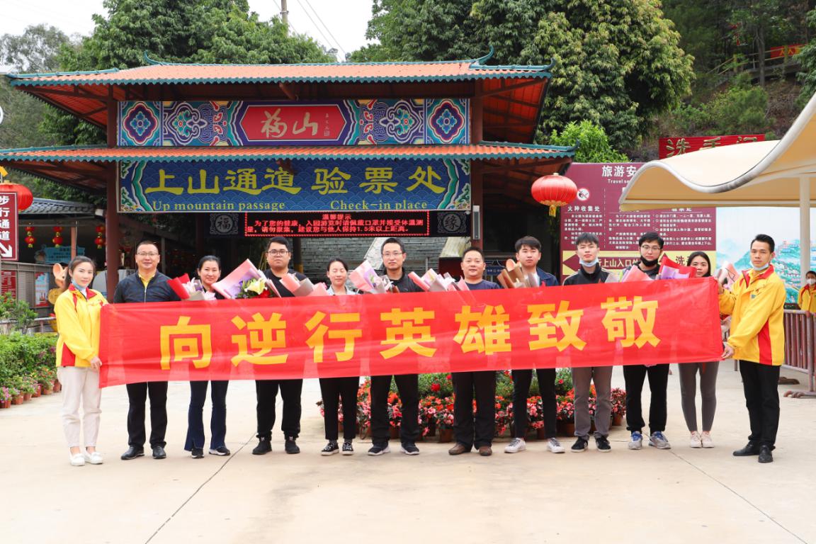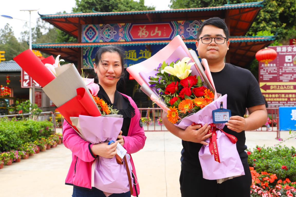 春天來臨,萬物復(fù)蘇,“春游踏青”再次成為了市民游客熱度極高的出游主題,也成為了連日奮戰(zhàn)的醫(yī)務(wù)工作者解壓放松、療養(yǎng)身心的出游選擇。恰逢周末,觀音山迎來了一批來自東莞市人民醫(yī)院、東莞東華醫(yī)院和康華醫(yī)院的醫(yī)護(hù)工作者們免費入園游玩,景區(qū)特意為每位醫(yī)護(hù)人員鮮花,致以敬意和感謝。此時的觀音山,正值花開滿園之際,山間的微風(fēng)夾雜著清新的森林空氣,醫(yī)務(wù)工作者們乘坐觀光車沿途而上,在攬秀臺前觀賞嬌艷的三角梅;登頂觀音山,醫(yī)護(hù)人員們不禁感慨開闊的視野和養(yǎng)眼的美景,并在吉祥苑中、同心鎖側(cè)、鵲橋上賞景,為家人、朋友、愛人許下健康喜樂的心愿。