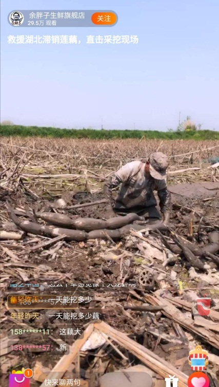 除了湖北的縣長、市長外,普通的湖北商戶不甘落后。8日上午,荊州洪湖的陽光明媚,“余胖子生鮮旗艦店”的店主便打開手機接通了直播,樸實的農(nóng)民性格讓他面對鏡頭一時不知該說什么好,簡單問好后,他就轉(zhuǎn)身下了塘,開始從厚重的泥土里拔出一根根新鮮的蓮藕。有不少00后網(wǎng)友是第一次見到挖藕的過程,他們發(fā)現(xiàn)原來潔白爽口的大藕居然是從泥中挖出來的,“挖藕真的太不容易了,一個上午要泡在塘泥里。”