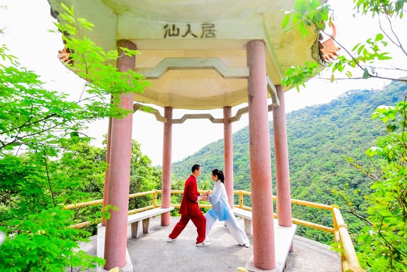 林海之間,清音回蕩,視野秀美的“八仙過海”旁,曲徑通幽的“仙人居”中,山巖之邊,有視野秀美之景,與太極拳的安靜自然、細膩綿柔、以柔克剛相得益彰;男女剛?cè)嵬剖中紊窦鎮(zhèn)?,融心于景;太極功夫扇展示中,渾厚的開扇聲在空中回響,為登山之旅增添了一抹濃厚的色彩。