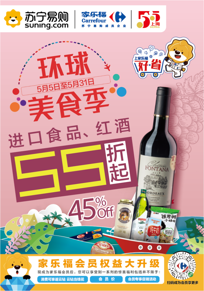 此外,家樂(lè)福方面還宣布將加大投入,全面支持上?!拔逦遒?gòu)物節(jié),全城打折季”。5月5日至31日,上海地區(qū)家樂(lè)福門(mén)店將開(kāi)啟“環(huán)球美食季”,精選來(lái)自法國(guó)、意大利、英國(guó)、西班牙、美國(guó)、加拿大、日本、韓國(guó)、馬來(lái)西亞等39個(gè)國(guó)家的350個(gè)品牌旗下共計(jì)3700多種進(jìn)口食品,與上海消費(fèi)者共襄盛舉。美食自然少不了美酒相伴,來(lái)自法國(guó)、意大利、西班牙、阿根廷、智利、澳洲等國(guó)家的70多個(gè)品牌旗下共計(jì)200多種進(jìn)口葡萄酒,也將悉數(shù)亮相全市家樂(lè)福門(mén)店。活動(dòng)期間,進(jìn)口食品低至5.5折起,進(jìn)口紅酒買(mǎi)一送一。進(jìn)博會(huì)“同款”法國(guó)奧格斯汀系列葡萄酒也將首次參與促銷(xiāo),葡萄酒愛(ài)好者不容錯(cuò)過(guò)。