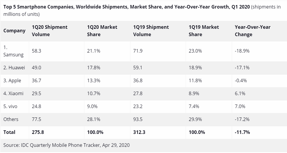 見(jiàn)圳客戶端·深圳新聞網(wǎng)2020年5月6日訊 國(guó)際權(quán)威機(jī)構(gòu)IDC最新報(bào)告顯示,全球智能手機(jī)出貨量在2020年第一季度同比下降11.7%。其中,三星、華為、蘋(píng)果依舊穩(wěn)居前三,分別為21.1%、17.8%和13.3%。
