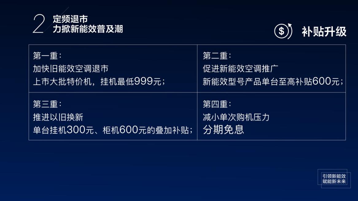 同時(shí),“新一級(jí)能效聯(lián)盟”還將持續(xù)開(kāi)展“空調(diào)節(jié)能風(fēng)暴”等綠色消費(fèi)讓利活動(dòng)。該活動(dòng)涵蓋四重補(bǔ)貼,分別是老能效清倉(cāng)、新能效補(bǔ)貼、以舊換新及分期免息,多管齊下加速新舊能效產(chǎn)品的切換、擴(kuò)大綠色消費(fèi)規(guī)模。