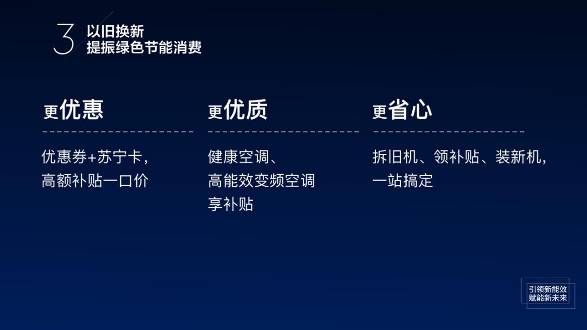 實(shí)現(xiàn)能效、健康升級(jí),以舊換新是“剛需”。2020年,蘇寧空調(diào)重磅加碼以舊換新,舊機(jī)估值一口價(jià),換新時(shí)購(gòu)買(mǎi)高能效變頻產(chǎn)品與健康空調(diào)可享高額補(bǔ)貼,同時(shí)為解決流程繁瑣問(wèn)題,將持續(xù)優(yōu)化拆舊機(jī)、領(lǐng)補(bǔ)貼、裝新機(jī)的一站式服務(wù),真正實(shí)現(xiàn)更優(yōu)惠、更優(yōu)質(zhì)、更省心。