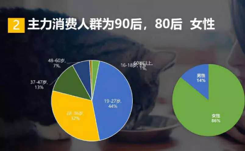 阿里巴巴利用線上平臺的數據給養(yǎng)寵人群畫了一個像,他們的主力軍是年輕人,其中80后與90后占比是70%,本科學歷占比達到50%,58%是女性。有意思的是從增長的幅度來看,男性養(yǎng)寵的增長速度最快,在過去一年增長了10%。