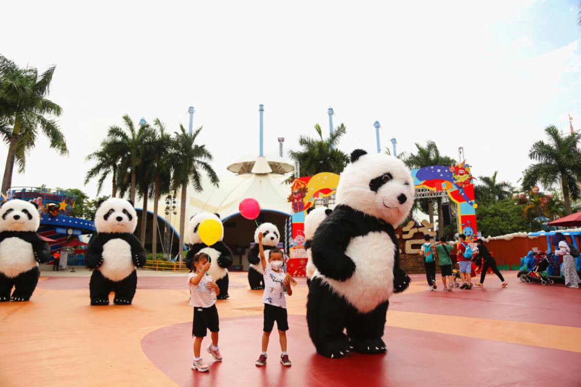 眾多戶外兒童項目備受親子客群青睞。夢幻泡泡、氣球表演更是引得小朋友們尖叫互動,拿著各色花式氣球,追逐著用繩索揮舞出的巨大彩色泡泡。10只2.5米高的熊貓玩偶、花車巡游吸引了眾多家庭游客駐足欣賞、拍照留念。