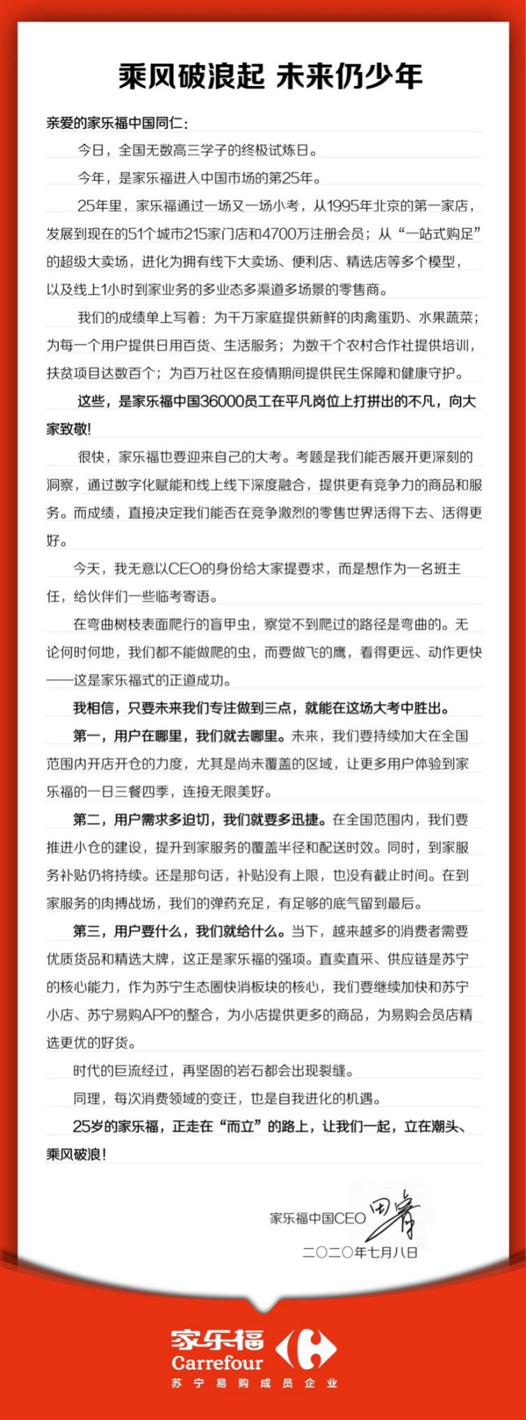 見圳客戶端·深圳新聞網(wǎng)2020年7月9日訊 今年,是家樂福進(jìn)入中國市場的第25個年頭。昨日,蘇寧家樂福CEO田睿發(fā)出內(nèi)部郵件,表示家樂?!盁o論何時何地,都不能做爬的蟲,而要做飛的鷹”,將持續(xù)加大在全國范圍內(nèi)開店開倉的力度,并通過小倉建設(shè)和補(bǔ)貼,提升到家服務(wù)的覆蓋半徑和配送時效。