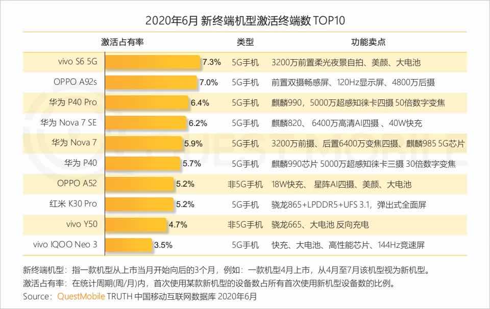 近期發(fā)布的《QuestMobile中國移動(dòng)互聯(lián)網(wǎng)2020半年大報(bào)告》顯示,“2020年6月新終端機(jī)型激活終端數(shù)Top10”的榜單中vivo S系列首款5G手機(jī)——vivo S6憑借3200萬(像素)前置柔光夜景自拍、美顏(功能)及大電池榮登榜首。值得一提的是,S6的迭代機(jī)型vivo S7目前也已經(jīng)曝光,將于8月3日正式發(fā)布。