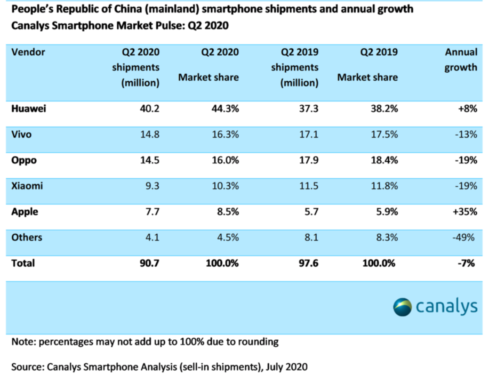 見圳客戶端·深圳新聞網(wǎng)2020年8月3日訊 知名調(diào)研公司Canalys發(fā)布的最新數(shù)據(jù)顯示,盡管與2019年第二季度相比市場萎縮了7%,但中國智能手機(jī)市場的季度環(huán)比增長了25%,在2020年第二季度達(dá)到9000多萬臺(tái)。