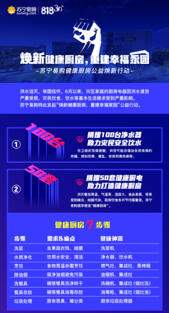 與此同時,洪水致使大批廚房電器受損,疊加高溫天氣,災(zāi)民飲食安全面臨考驗。蘇寧易購特別捐贈50套健康廚電,涵蓋油煙機、灶具、消毒柜等必備廚房電器,讓災(zāi)民更快恢復健康生活。同時,廚房作為“病從口入”最關(guān)鍵的環(huán)節(jié),洗菜、水質(zhì)凈化、烹飪除油煙、餐具清潔消毒、廚余垃圾處理等每一環(huán)都不容忽視,蘇寧易購特別倡導“健康廚房7步驟”,全流程打造健康廚房,并借助蘇寧易購雙線渠道全面開展科普活動。