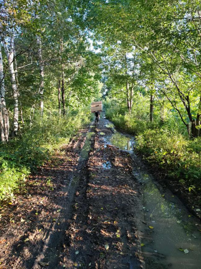 一路開下來,車身濺起不少泥垢??斓侥康牡貢r,一段泥濘的林間小路攔住了王能的去路。原來,道路積水過多,泥土過軟,車輛不能前行。王能隨即將車停靠在路邊,直接卷上褲腿,扛起電視前行。兩公里的林間路,本就不輕松,扛著電視更是“難上加難”。