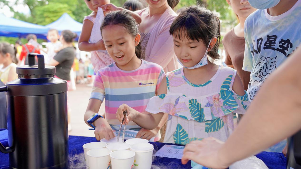 杯子里的干冰劇烈翻滾著,白色的煙霧一團(tuán)團(tuán)冒出,轄區(qū)居民好奇的看著劇烈升騰的煙霧?!吧衿鎲幔窟@就是干冰的升華現(xiàn)象”在“科學(xué)干冰秀”區(qū)域,工作人員邊演示邊為居民講解干冰升華原理。