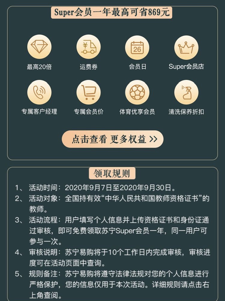 9月7至9月30日,凡持有效“中華人民共和國教師資格證書”的老師,在蘇寧易購AP P上搜索“教師”,進(jìn)入 Super會員領(lǐng)取頁面,填寫個(gè)人信息并上傳資格證書和身份證。通過審核后,即可免費(fèi)領(lǐng)取蘇寧Super會員年卡一張。