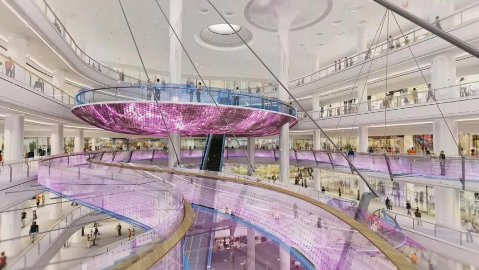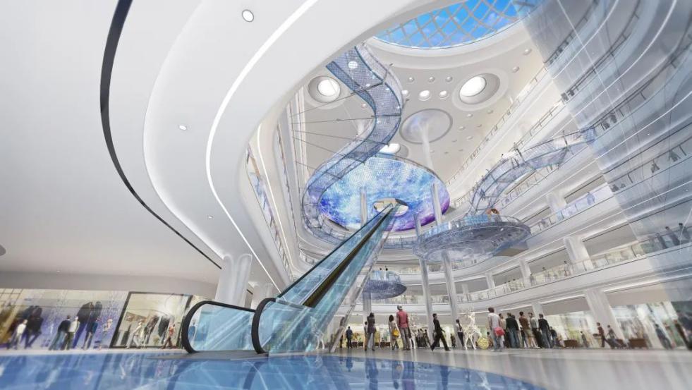 場景創(chuàng)新,獨具特色的創(chuàng)新商業(yè)場景,打造城市潮流打卡地。1500平米的超大中庭設(shè)計直通六層、高達(dá)30米的世界最高商業(yè)室內(nèi)扶梯,2500平米巨型天幕、長達(dá)77.77米的室內(nèi)玻璃棧道,營造網(wǎng)紅科幻場景。結(jié)合業(yè)態(tài)規(guī)劃,設(shè)置時代列車、鵬程九天、無限活力、寶貝王國、鵲橋相會、尋味九州、不夜天階等七大主題場景,營造沉浸式商業(yè)氛圍。