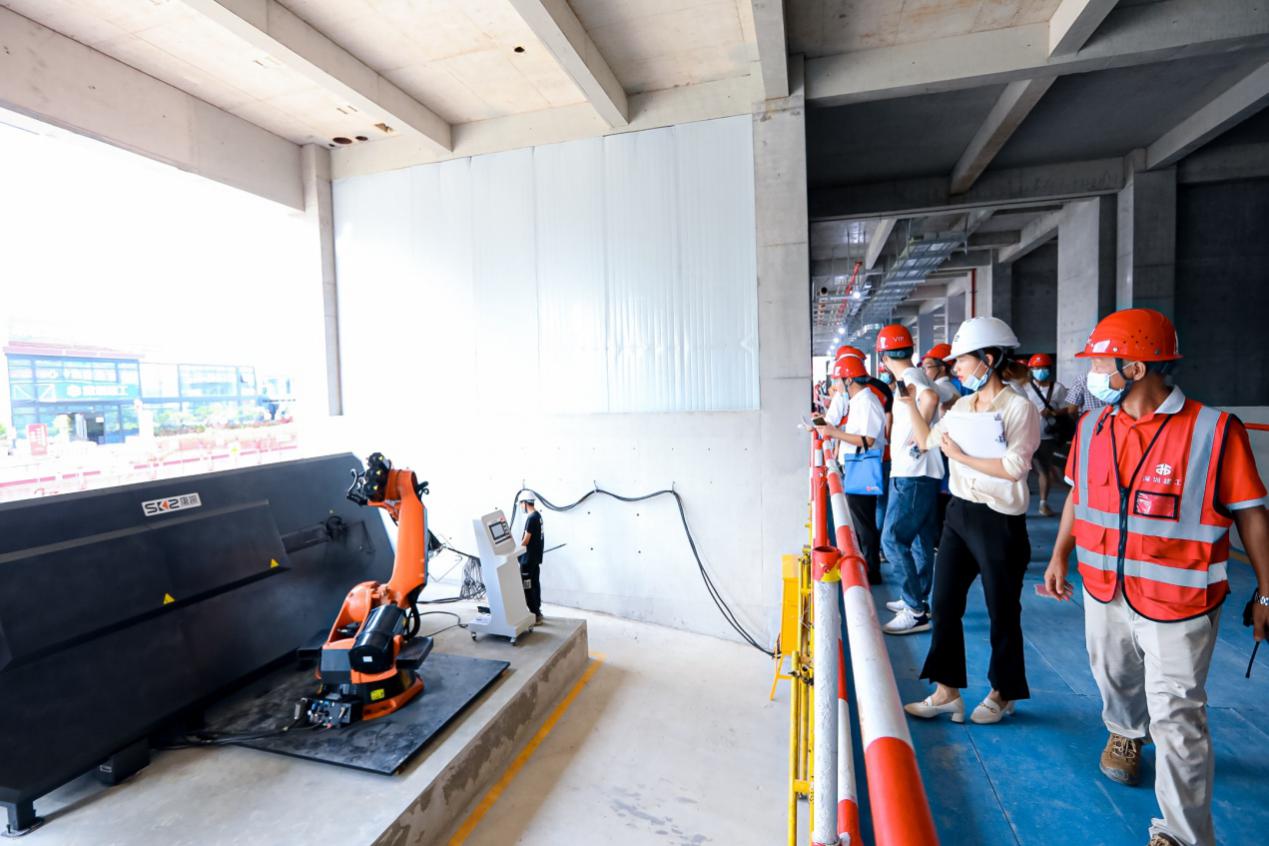 此次觀摩由“三中心一展區(qū)”構(gòu)成,即創(chuàng)魯班獎優(yōu)秀工藝展示中心、科技創(chuàng)新中心、智能指揮中心和建筑內(nèi)展區(qū)。觀摩主要亮點有黨建引領(lǐng)高質(zhì)量發(fā)展、質(zhì)量管理體系與機制(參建方質(zhì)量管理體系、6σ管理、質(zhì)量管理標準化、精細化)、創(chuàng)魯班獎優(yōu)秀工藝展示、市工務署優(yōu)秀工藝工法展示、工程質(zhì)量常見問題治理(樣板引路)、智能建造推動質(zhì)量提升(科技創(chuàng)新展示、抹灰機器人、實測實量機器人等智能建造設(shè)備實操演示、BIM技術(shù))、智慧工地展示(“e工務”APP應用與推廣、智慧工地、智能指揮等)、6S管理等,通過現(xiàn)場講解員的介紹,使觀摩人員更加清晰且深入的了解相關(guān)內(nèi)容。