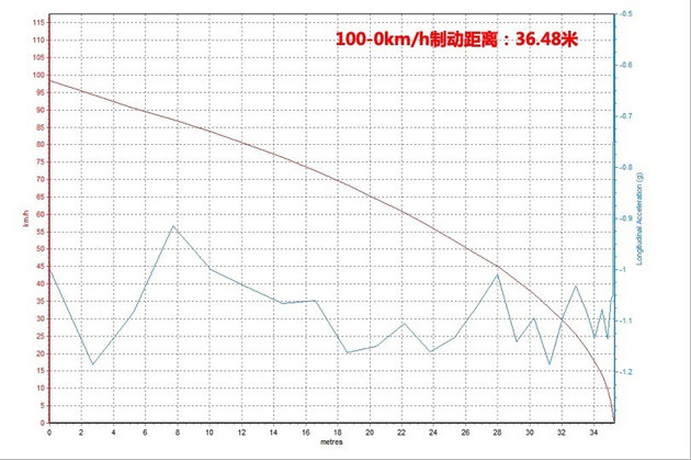 從制動(dòng)過程的曲線圖來看,車輛剎車初段和末段的剎車力度浮動(dòng)比較明顯,其中部分原因是測(cè)試場(chǎng)地的地面有很多細(xì)小的砂石,在全力剎車的時(shí)候輪胎的抓地力會(huì)受到一定的影響,因此剎車力度沒有辦法做到完全線性。