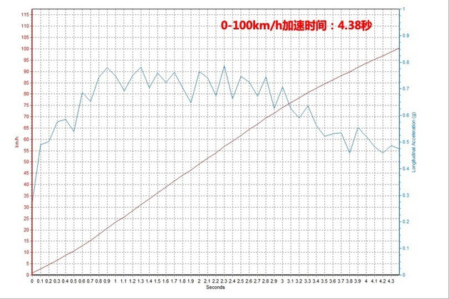 從加速成績(jī)的曲線圖我們可以看到,車輛只用了0.6秒就達(dá)到了一個(gè)較高的G值(0.7-0.8G),并且一直未出到75km/h左右,因此中前段的加速過程是相當(dāng)持續(xù)且穩(wěn)定的。