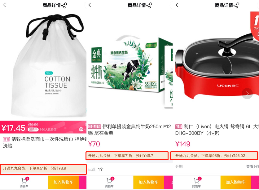 其中,原價(jià)19.9元的潔致綿柔洗臉巾只需8.9元即可到手,會員用戶在享受會員日常價(jià)基礎(chǔ)上,疊加享受5.1折;伊利金典純牛奶原價(jià)70元,九九會員可享受7.1折,49.7元就能到手;原價(jià)149元的利仁電火鍋,九九會員可享受9.8折,到手價(jià)146.02元。此外,部分小家電產(chǎn)品還可領(lǐng)取滿500減50、滿800減80等滿減優(yōu)惠券,享受折上折。