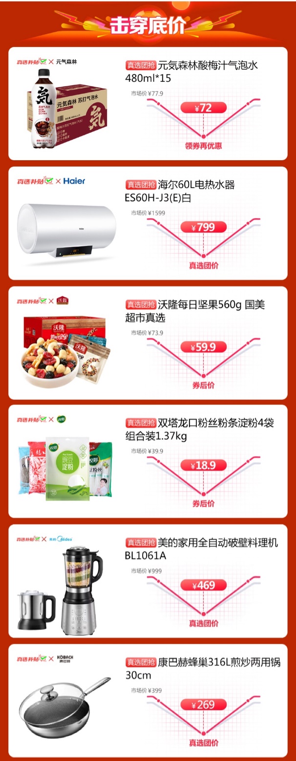 參與真選萬人團的產(chǎn)品,大家電如海爾電熱水器,市場價1599元,真選團購價低至799元;美的滾筒洗衣機,市場價3599元,真選團購價2499元……優(yōu)惠力度非常之大,部分產(chǎn)品優(yōu)惠可超千元。
