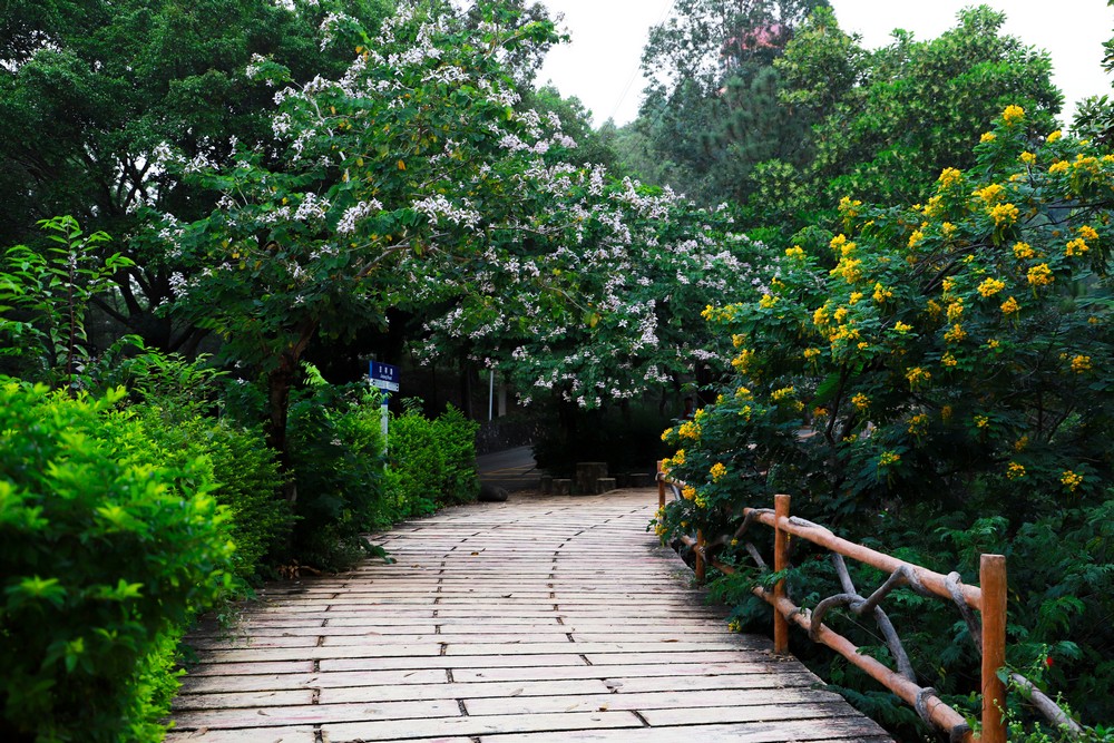 季節(jié)交替之際,在觀音山上,異木棉花并非“一花獨秀”。景區(qū)內不僅有美艷的異木棉,還有成片的紫荊花、勒杜鵑、桂花等。此時漫山花兒都已經(jīng)絢爛綻放,裝點在景區(qū)沿途,尤其是山頂感恩廣場,主干道兩邊,紫荊花整齊劃一地排列在路兩邊,這又是所有游客的必經(jīng)之路,花兒像在夾道歡迎廣大游客的到來。漫步其中,宛若置身于萬紫千紅的花海,與大自然的浪漫不期而遇,收獲“滿山花海畫中游”的絕妙體驗。