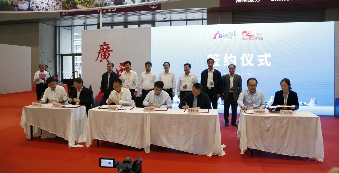 在第三屆深圳餐飲博覽會廣西館開館及項目簽約儀式上,順豐集團——深圳市豐農(nóng)科技有限公司、深圳市京基智農(nóng)時代股份有限公司、新希望六合股份有限公司等單位與廣西壯族自治區(qū)農(nóng)業(yè)農(nóng)村廳達成了戰(zhàn)略合作共識,深圳寶能集團與自治區(qū)供銷社達成了戰(zhàn)略合作共識。其中,自治區(qū)農(nóng)業(yè)農(nóng)村廳與深圳市豐農(nóng)科技有限公司簽訂《品牌農(nóng)產(chǎn)品全產(chǎn)業(yè)供應(yīng)鏈戰(zhàn)略合作協(xié)議書》,重點是就“廣西好嘢”品牌農(nóng)產(chǎn)品全產(chǎn)業(yè)供應(yīng)鏈升級開展合作,豐農(nóng)科技將在廣西特色農(nóng)產(chǎn)品優(yōu)勢區(qū)投資建建設(shè)17個順豐速運預(yù)處理中心,搭建三級物流及冷鏈體系體系;與深圳市京基智農(nóng)時代股份有限公司就共同推進廣西生豬產(chǎn)業(yè)高質(zhì)量發(fā)展體系建設(shè)簽訂 《戰(zhàn)略合作框架協(xié)議》,協(xié)同推進年出欄500萬頭生豬全產(chǎn)業(yè)鏈,構(gòu)建現(xiàn)代加工流通體系;與新希望六和股份有限公司簽訂《“鄉(xiāng)村振興”生態(tài)循環(huán)農(nóng)業(yè)戰(zhàn)略合作框架協(xié)議》推進1800萬頭生豬養(yǎng)殖全產(chǎn)業(yè)鏈項目和數(shù)字農(nóng)業(yè)產(chǎn)業(yè)園建設(shè),總投資200億元。深圳寶能集團與自治區(qū)供銷社就廣西(寶能)大生鮮流通平臺及供銷冷鏈網(wǎng)絡(luò)建設(shè)簽訂 《戰(zhàn)略合作協(xié)議》。同時,深圳韓山文化發(fā)展有限公司與廣西宏華生物實業(yè)股份有限公司簽署約3000萬元的合作協(xié)議,廣州市光之彩候鳥超市連鎖有限公司與玉林老芳食品有限公司簽署5000萬的購銷協(xié)議,廣東潤華商業(yè)有限公司與北海福星商貿(mào)有限公司簽定1000萬的采購協(xié)議,廣東東莞市順大廚餐飲服務(wù)有限公司與廣西武鳴綠世界生態(tài)農(nóng)業(yè)投資有限公司簽訂1600萬采購協(xié)議。
