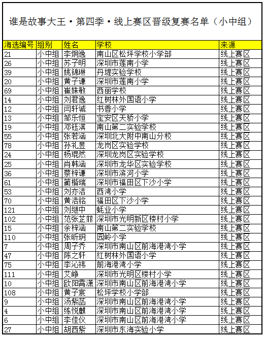 附:“誰(shuí)是故事大王·第三季”-線上賽區(qū)晉級(jí)深圳市復(fù)賽名單