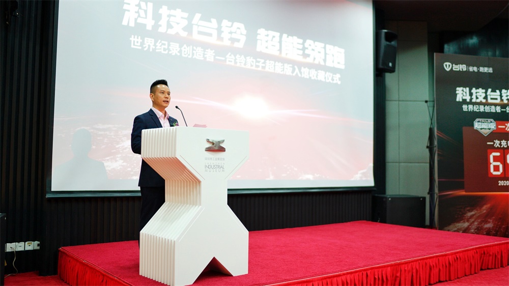 深圳市工業(yè)展覽館副館長潘文峰,深圳電動車產(chǎn)業(yè)促進委員會執(zhí)行會長楊華,臺鈴集團董事長孫木鉗、臺鈴集團總裁助理兼公關(guān)總監(jiān)胡東文等嘉賓齊聚深圳市工業(yè)展覽館,參加了以“科技臺鈴超能領(lǐng)跑”為主題的世界紀(jì)錄創(chuàng)造者——臺鈴豹子超能版入館收藏儀式,共同見證了這一榮光時刻。
