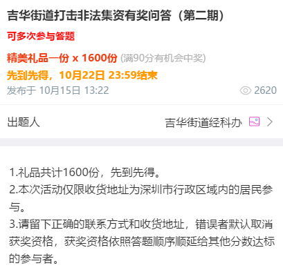 為激發(fā)轄區(qū)居民參與打擊非法集資的熱情,吉華街道經(jīng)科辦組織開展了打擊非法集資知識有獎問答活動和轉(zhuǎn)發(fā)打擊非法集資宣傳推文朋友圈打卡活動,寓教于樂,切實普及打擊非法集資相關(guān)知識,提高居民自我保護能力,引導轄區(qū)居民參與到防范和打擊非法集資活動中來,做到轄區(qū)人人不參與、能識別、敢揭發(fā)、會舉報非法集資,共同維護轄區(qū)的和諧穩(wěn)定?;顒娱_展以來,轄區(qū)居民積極踴躍參與,共計3000余民轄區(qū)居民參與其中,派發(fā)禮品2000份。