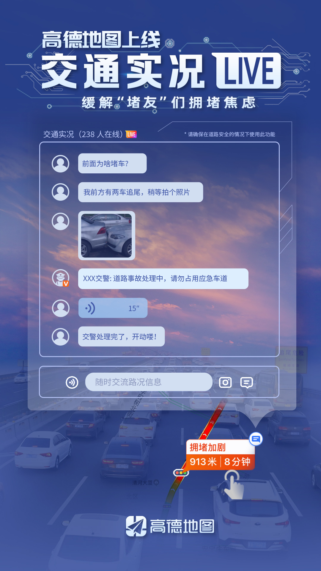 通過這個平臺,各地交管部門可及時發(fā)布擁堵事件的權(quán)威信息,如擁堵原因、派警情況、預(yù)計疏通用時及現(xiàn)場圖片等。當(dāng)用戶進入嚴(yán)重?fù)矶侣范螘r,通過點擊提醒氣泡即可進入該界面,實時了解擁堵信息。在車輛因堵車無法行進時,“堵友”們還可以互通有無,通過文字、語音、圖片等多種方式,為后方司機分享第一手信息。而當(dāng)擁堵疏散時,“交通實況”功能也將自動關(guān)閉。
