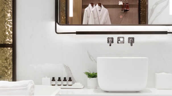 夜幕降臨,賓客可慵懶地置身浴缸之中,閉目享受由B&O音響帶來的音樂廳般沉浸式體驗?;驈娘h臺取過剛剛煮好的香茗,讓茶香雅韻充盈唇齒。酒店備好的浴品套裝,將讓賓客從發(fā)絲到肌膚,皆浸潤于LE LABO的香氛宇宙,奢寵體驗無與倫比。