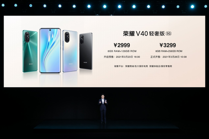 榮耀V40輕奢版擁有幻夜黑、藍(lán)水翡翠和鈦空銀三種配色,提供8GB+128GB、8GB+256GB兩個(gè)內(nèi)存版本,售價(jià)分別為2999元和3299元。3月26日10:08在線上線下全平臺(tái)開(kāi)售,用戶可通過(guò)榮耀商城及各大授權(quán)電商平臺(tái)或前往榮耀線下體驗(yàn)店、榮耀授權(quán)零售門(mén)店進(jìn)行購(gòu)買。