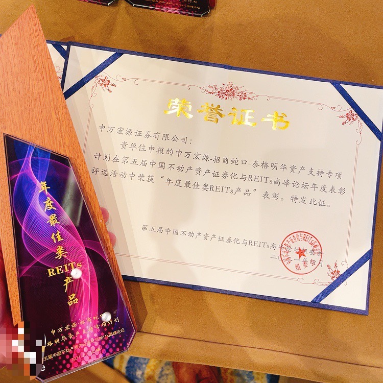 與招商蛇口申報(bào)基礎(chǔ)設(shè)施公募REITs同時(shí),由中國(guó)房地產(chǎn)業(yè)協(xié)會(huì)聯(lián)合中國(guó)REITs聯(lián)盟等主辦的“第五屆中國(guó)不動(dòng)產(chǎn)資產(chǎn)證券化與REITs高峰論壇”上,憑借申萬(wàn)宏源-招商蛇口-泰格明華資產(chǎn)支持專(zhuān)項(xiàng)計(jì)劃,招商蛇口獲評(píng)為“最佳原始權(quán)益人”,泰格明華項(xiàng)目獲得“年度最佳類(lèi)REITs產(chǎn)品”獎(jiǎng)項(xiàng)。