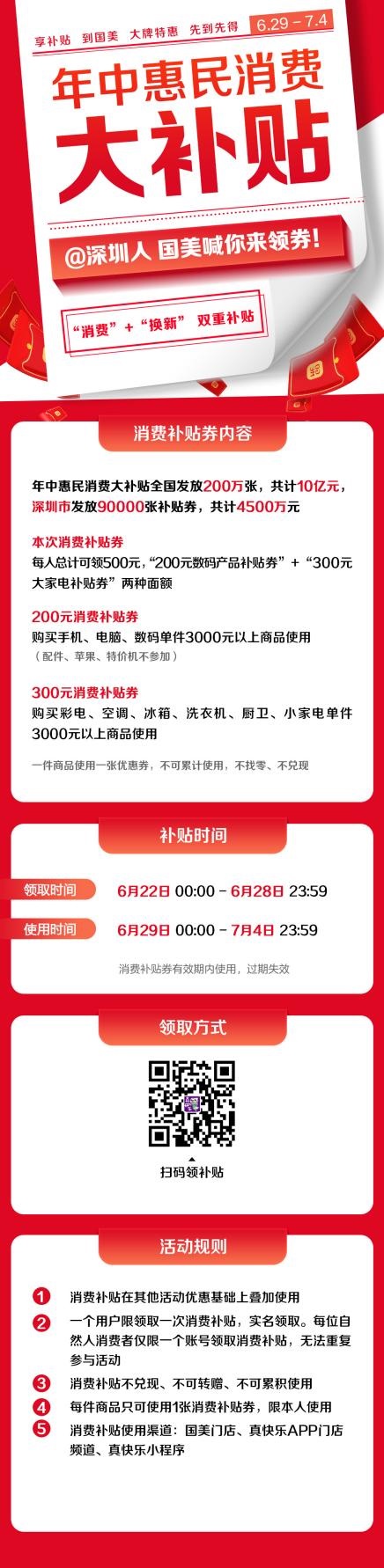 本次活動(dòng)分為惠民消費(fèi)和換新兩種補(bǔ)貼形式,發(fā)券時(shí)間為6月22日至6月28日,用券時(shí)間為6月29日至7月4日。