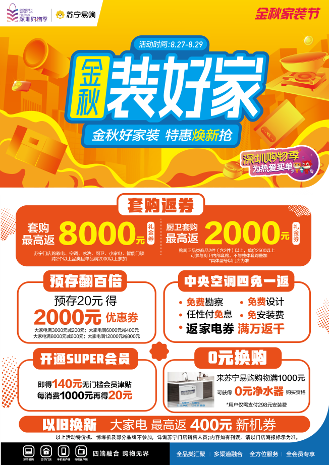 而9月9日到9月12日期間,蘇寧易購(gòu)將開(kāi)啟涉及全品類(lèi)的金秋家裝節(jié),并且將會(huì)聯(lián)合海信一起開(kāi)啟909嗨購(gòu)盛典,屆時(shí)不僅會(huì)有大牌匯聚,福利補(bǔ)貼,還將會(huì)有家裝品牌共同加入,聯(lián)手提供一站式裝修解決方案,一同為消費(fèi)者避開(kāi)家裝過(guò)程中的那些坑。同時(shí)深圳購(gòu)物季也在持續(xù)進(jìn)行中,蘇寧易購(gòu)作為指定電商平臺(tái),為深圳市提供了一億元的消費(fèi)補(bǔ)貼,消費(fèi)者在深圳市蘇寧易購(gòu)門(mén)店參與以舊換新活動(dòng),大家電產(chǎn)品最高可以補(bǔ)貼400元,手機(jī)產(chǎn)品最高可以補(bǔ)貼1600元,電腦產(chǎn)品最高享受88折優(yōu)惠。另外蘇寧易購(gòu)還開(kāi)設(shè)了“圳品專(zhuān)區(qū)”,里面匯聚深圳本土大牌產(chǎn)品,折扣低至五折起。