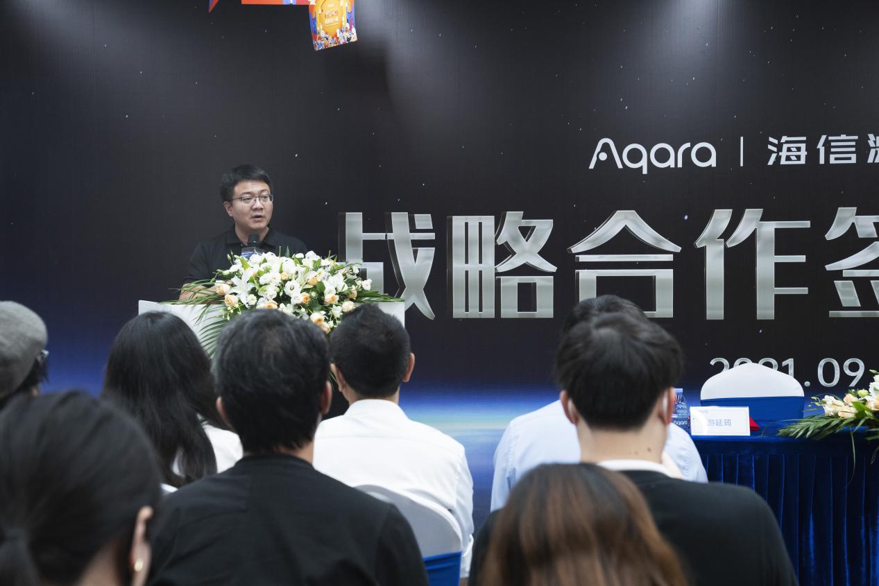 致辭環(huán)節(jié),海信集團控股公司副總裁于芝濤也發(fā)來了線上祝福視頻,表達了對這次雙方合作,共同致力全屋智能美好體驗再升級的美好祝愿。與此同時,青島海信激光顯示股份有限公司的副總經理王偉介紹了海信電視在戰(zhàn)略發(fā)展方向上的重塑新定位、新技術應用、產品優(yōu)勢以及所取得的階段性成就等,并表示Aqara作為全球智慧生活方式的先行者和引領者,致力于打造「千人千面」的全屋智能生活方式,要做更懂用戶的“家”,這和海信電視“顯示無處不在,服務無處不在,連接無處不在”的發(fā)展理念不謀而合。除去智能化,雙方與生俱來的“綠色基因”更加夯實了這種合作契因,并始終堅信,未來海信電視與Aqara將會不斷用綠色智能科技提升大家的家居生活品質,打造大屏時代的綠色客廳,引領中國IoT的發(fā)展。