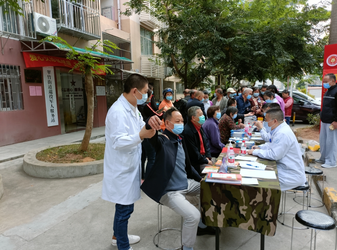 12月19日上午,深圳市人民醫(yī)院疼痛科11名專家與護士攜帶血壓計、血糖儀、聽診器、理療儀等儀器到街道退役軍人服務站開展“愛心義診送健康,為民服務暖人心”關愛退役軍人義診活動。為防范疫情風險,服務站將健康服務分區(qū)域并安排工作人員查驗健康碼、行程碼、測體溫,參與人員須佩戴口罩方能進入活動現(xiàn)場。在服務站門口通風處設置血糖與血壓測量處、專家醫(yī)生坐診處,在老兵活動室開展健康知識講座,在黨建活動室和老兵談心室開展身體理療服務。所有服務同時開展,退役軍人和居民自主決定參與順序,避免扎堆。