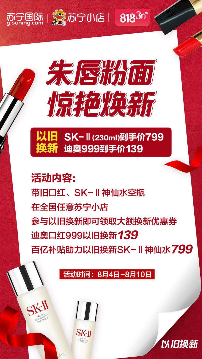 消費者可以帶家中不用的舊口紅、神仙水空瓶在全國任意蘇寧小店,參與以舊換新活動,即可領取大額優(yōu)惠券,用于購買新口紅和神仙水。