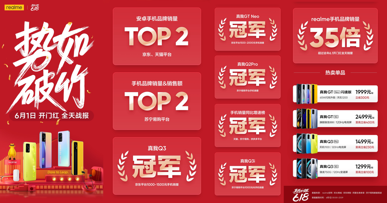 智能手機(jī)品牌realme真我公布618開(kāi)門紅首日戰(zhàn)報(bào):realme真我斬獲京東、天貓平臺(tái)安卓手機(jī)品牌銷量TOP2,蘇寧易購(gòu)手機(jī)品牌銷量&銷售額TOP2,成為天貓、蘇寧易購(gòu)、拼多多平臺(tái)手機(jī)銷量同比增速榜冠軍,手機(jī)品牌銷量超過(guò)去年開(kāi)門紅全天銷量35倍,創(chuàng)下品牌618開(kāi)門紅歷史最佳成績(jī)!