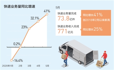 5月我國(guó)快遞業(yè)務(wù)量完成73.8億件,同比增長(zhǎng)41%,創(chuàng)2018年2月以來(lái)新高。